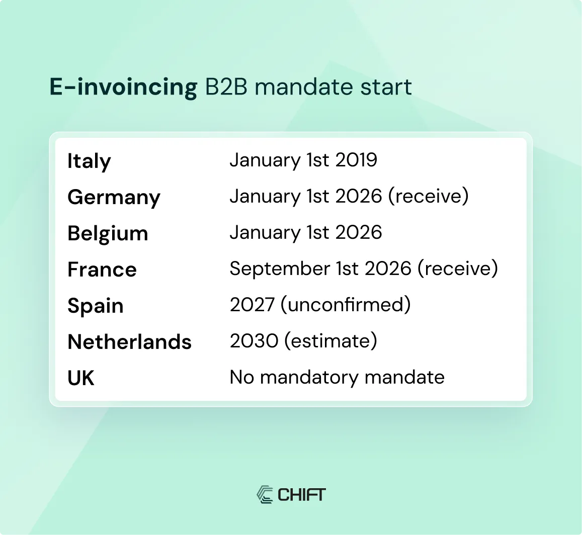 Deadlines vary by country, but the direction is clear: all of Europe is converging toward mandatory electronic invoicing. For example: