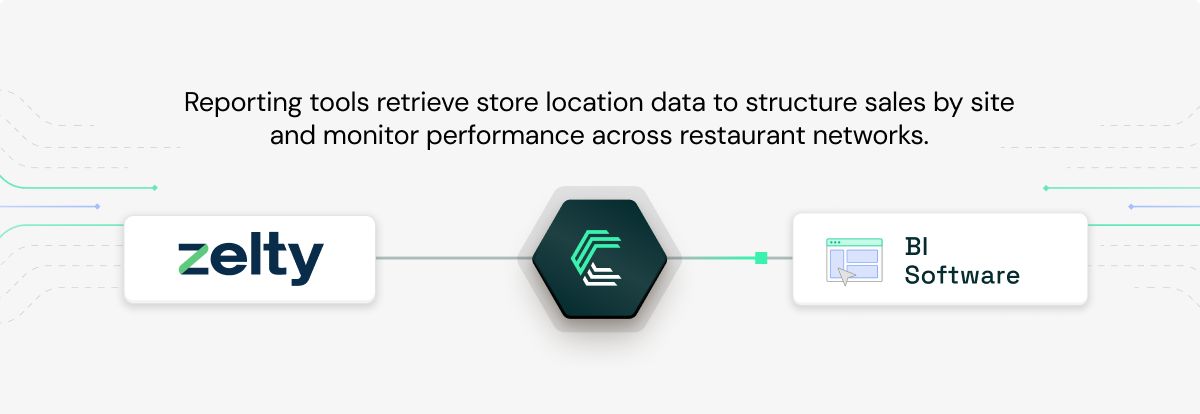Reporting tools can retrieve store location data to structure sales by site and monitor performance across restaurant networks.