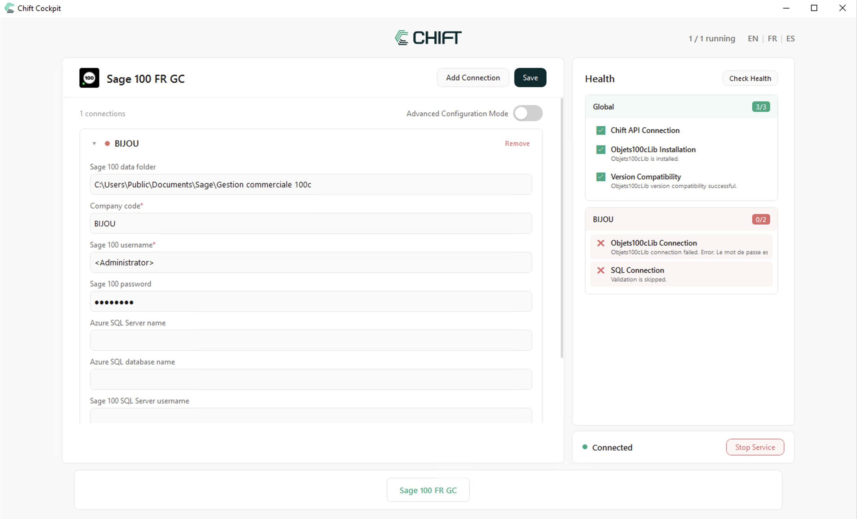 Cockpit provides a unified interface to manage connector settings, host addresses, credentials, file paths, and more. Sensitive fields such as passwords and tokens are DPAPI-encrypted and masked on screen. Advanced configuration fields are hidden by default and can be revealed when needed, keeping the interface clean for standard use cases.