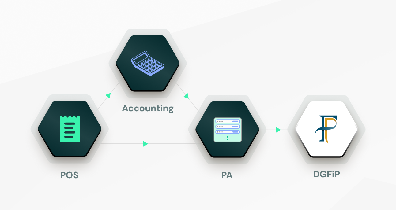 The transmission chain works as follows: data originates from the POS system, may pass through management software, and is then transmitted to an Accredited Platform (PA) which routes it to the DGFiP. If the POS does not produce structured, standardised, and fiscally accurate data from the outset, the entire chain collapses.