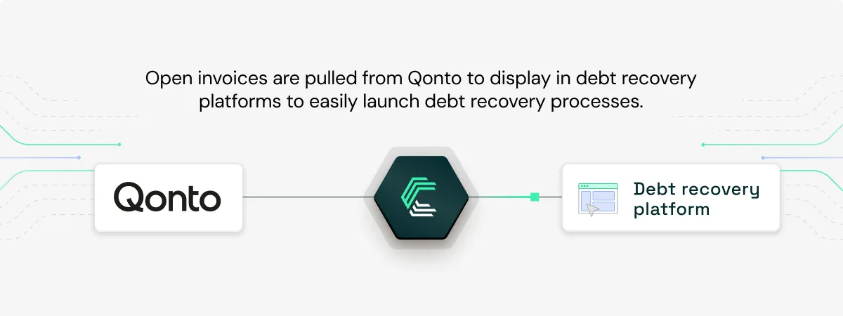 Debt recovery platforms like GCollect, LegalCity, and Rubypayeur connect to Qonto via Chift to automatically retrieve open receivables and trigger debt collection processes. This eliminates manual tracking and ensures timely action on unpaid invoices.