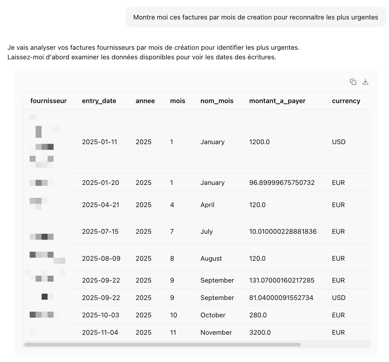 Dans notre test, nous avons parcouru un scénario auquel de nombreuses équipes financières sont confrontées quotidiennement : la gestion des dettes fournisseurs. Au lieu de naviguer plusieurs menus de leur logiciels de comptabilité, nous avons simplement demandé à l'IA : "Quelles sont les factures fournisseurs restant à payer ?"