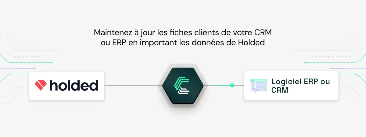 Gardez votre CRM ou ERP parfaitement aligné avec Holded en synchronisant automatiquement les données clients. Cela permet d’améliorer la cohérence des données et d’optimiser les parcours de vente.